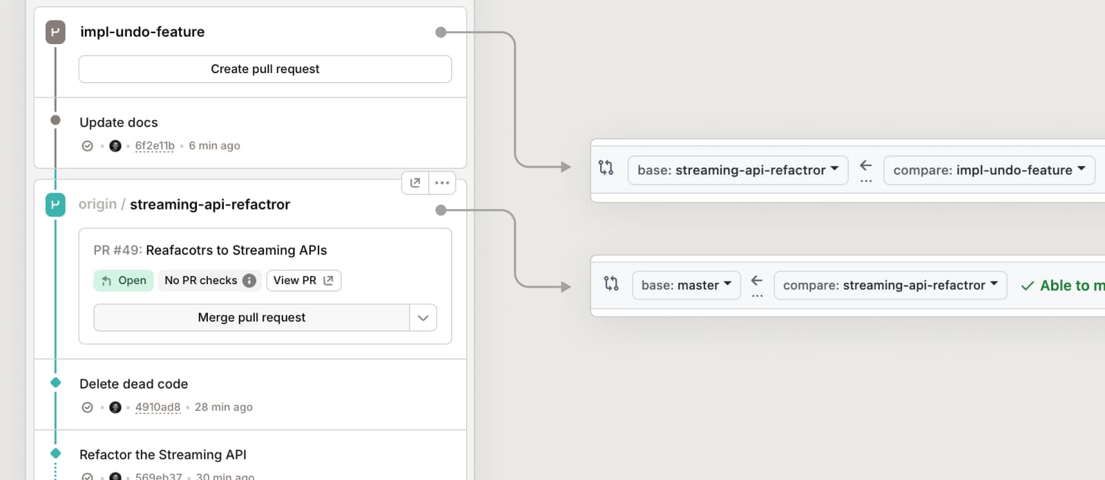 1. Pushing is done for the stack as a whole. Note: The Pull Requests will be created in a way where each branch points to its parent - see Automatic branch deletion